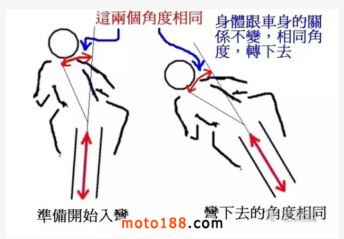 等熟練了以后, 再接下去側(cè)掛一邊屁股,可是先不要把膝蓋伸出去。很重要。不要把身體的重力全部放在座墊上,腳多用一些力氣,屁股跟身體一起移動(dòng)出去,等到車身穩(wěn)定了,再Counter Steer入彎倒下去。你的下半身要穩(wěn),要用外側(cè)大腿,和內(nèi)側(cè)腳的力量,腰的力量,尤其是肚子的力量,因?yàn)槟闵眢w歪出去,可是手是輕松的,所以身體要靠下半身和肚子的力量支撐。