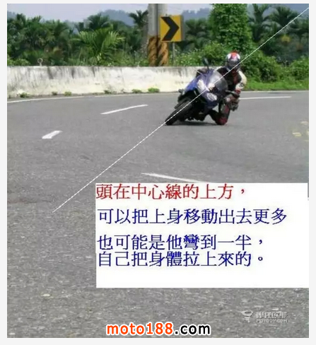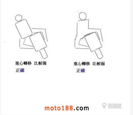 可是我注意到大家都很想 直接學(xué)賽車手磨膝蓋,這是完全錯(cuò)誤。這少了中間重要的過程,而且道路上的側(cè)掛是不磨膝蓋的。學(xué)習(xí)側(cè)掛先要知道,側(cè)掛最需要你的上半身。因?yàn)樯眢w大部份的重量在上半身,而且因?yàn)樯习肷淼闹匦母?,因?yàn)榱氐年P(guān)系,上半身對(duì)車身重心的影響最大,超過你側(cè)掛屁股的影響。除非你有個(gè)大屁股,你的體重都集中在屁股上,那就另當(dāng)別論了。
