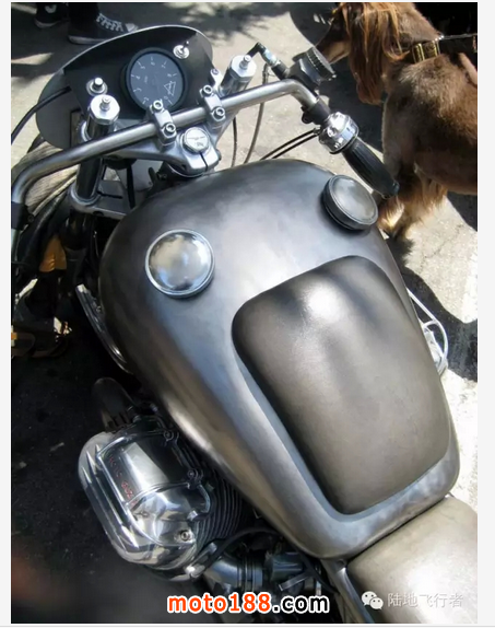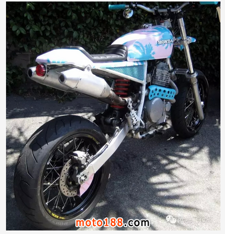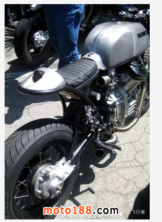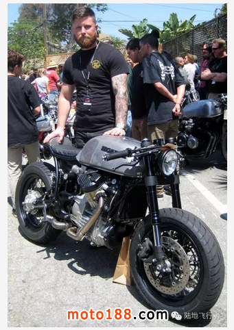 Deardorrff原來的定制計劃是改裝前叉和車座部分,但后來計劃變得越來越瘋狂!為了能夠容納一個取自2008 款CBR600RR的后減震,喬什對油箱和油箱蓋和前叉部分都進行了重新設(shè)計,成了現(xiàn)在大家看到的這個咖啡賽車的樣式。這輛摩托的前懸架是從本田CBR600RR改造而來。前輪轂是來自本田CB750,后輪轂則是來自本田金翼GL1000 。