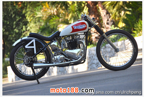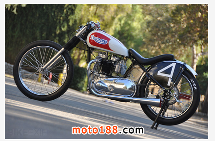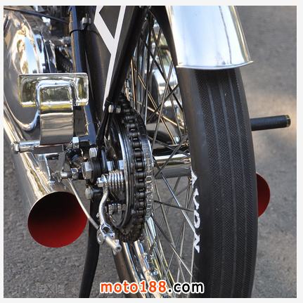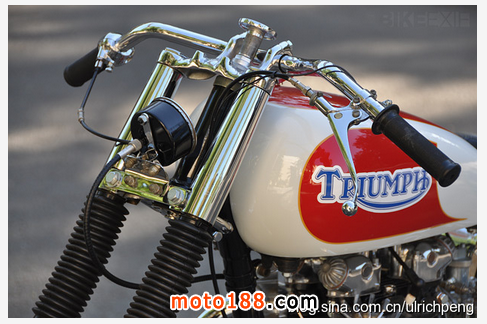 這臺1951年出廠的凱旋雷鳥被Sirkegian翻修一新,但完全保留了當(dāng)年的原貌。當(dāng)初為了適應(yīng)南加州賽車協(xié)會SCTA的要求,整車的動力系統(tǒng)都被加以強化,發(fā)動機在拓缸后換上了特制的040大尺寸曲軸連桿和小號的正時齒輪,改裝的缸頭為發(fā)動機增加了進氣和排氣量。這臺雷鳥當(dāng)時參加的是650cc組別的直線競速,如今我們開來倒是臺很拉風(fēng)的美式Bobber,尤其是將排氣管里面漆成紅色,真是悶騷到了極點。這不最近時裝設(shè)計師 Christian Louboutin 就正在和圣羅蘭YSL因紅色高跟鞋底的設(shè)計專利打著如火如荼的官司,看來全世界的男人真的都很喜歡這種驚鴻一瞥的美感。