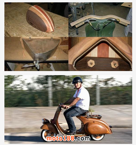 最大的挑戰(zhàn)相信就是給木頭材質(zhì)塑形的過(guò)程,數(shù)十只扳手齊心協(xié)力搞定了這一切。Carlos Alberto 為車身設(shè)計(jì)了漂亮的意大利Napolitan 條紋,無(wú)論是輪箍?jī)?nèi)部、腳撐、車把、坐墊、燈罩、坐架甚至車牌,全部運(yùn)用了木頭材質(zhì),配合上Napolitan 條紋足以令你心動(dòng)。突然好羨慕Daniela 有位這樣的父親!