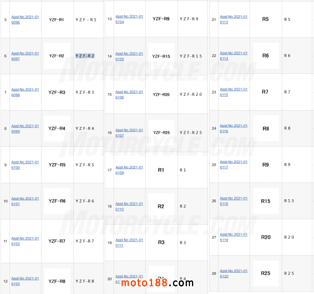 近日又獲悉Yamaha已在日本提出了新的商標申請,其中提出了從R1到R9以及YZF-R15,YZF-R20和YZF-R25的所有YZF型號。R1,R3和R6均存在,小排量R15和R25模型也存在。我們知道會有新的R7上市,但是商標暗示Yamaha也正在考慮R2,R4,R5,R8和R9,以及小排量R20型號。